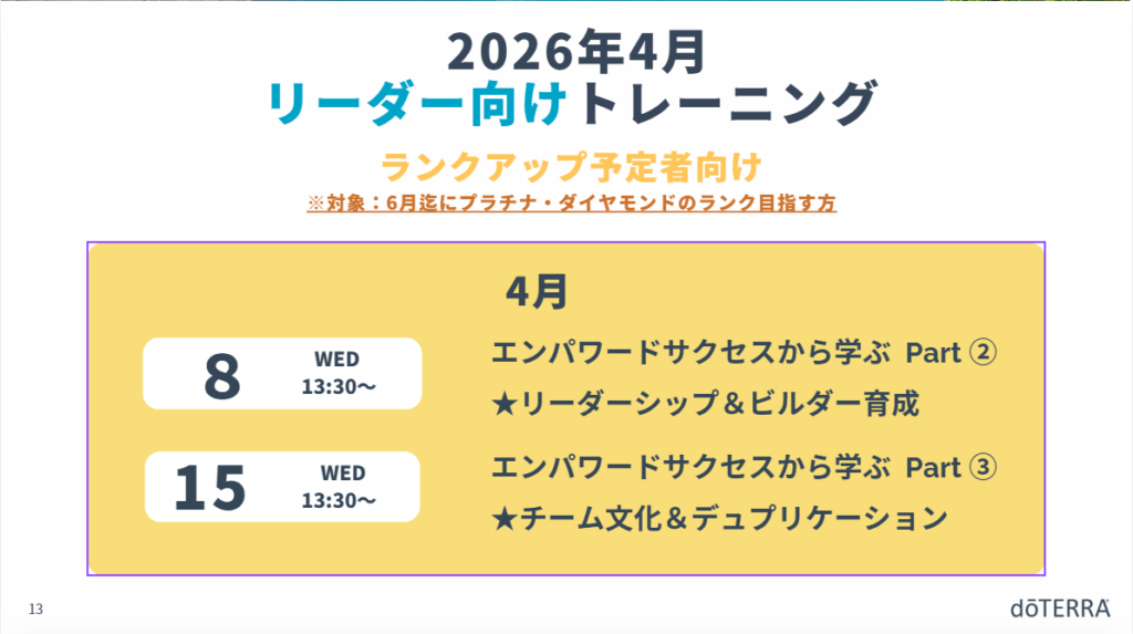 ①「基本を学ぶ」トレーニング:ドテラと製品、仕組みについての基本を学びます。