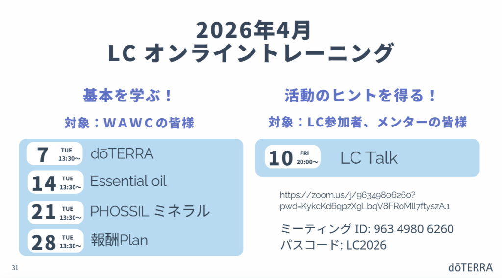 参加者申込マニュアル:https://www.doterra-info.jp/wp-content/uploads/2026/02/2026LC_Entry_Guide.pdf